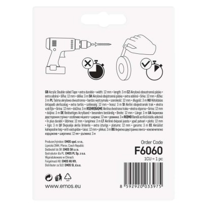 Akrylová páska 12mm / 3m, čirá dĺžka návinu: 3 m|elektrická pevnosť minimálne: neuvádza sa|elektrická pevnosť po vlhku minimálne: neuvádza sa|farba: číra|hrúbka pásky: 1,00 mm|integrovaná textilná sieťka: neuvádza sa|materiál lepidla: akryl|odolné UV: áno|odporúčaná skladovacia teplota: 5–40 °C|pevnosť v ťahu: neuvádza sa|potlač: bez potlače|predajný obal: 1 ks, blister|predĺženie minimálne: neuvádza sa|predpokladané použitie: hobby, dielňa, záhrada|priľnavosť k oceli […] zobraziť celý popis