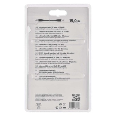 dĺžka: 15 m|konektory: IEC vidlica – IEC zásuvka|materiál: PVC|počet tienení: 2|predajný obal: 1 ks, blister|typ konektorov: 2× priame