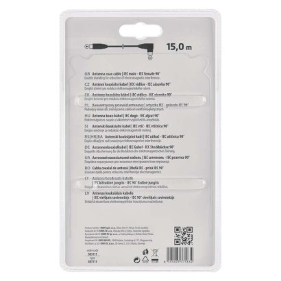 dĺžka: 15 m|konektory: IEC vidlica – IEC zásuvka 90°|materiál: PVC|počet tienení: 2|predajný obal: 1 ks, blister|typ konektorov: 1× priamy, 1× uhlový