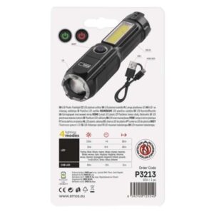 Dobíjacia plastová baterka LED P3213, 110 lm, 1 200 mAh batérie súčasťou balenia: áno|doba nabíjania: 2 h|doba svietenia: 2,5–4,5 h|doba svietenia detail: LED 100% - 4 h, LED 50% - 4,5 h, COB LED 100% - 2,5 h|dosvit: LED 100 % – 150 m, LED 50 % – 130 m, COB LED 100 % – […] zobraziť celý popis
