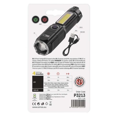 batérie súčasťou balenia: áno|doba nabíjania: 2 h|doba svietenia: 2,5–4,5 h|doba svietenia detail: LED 100% - 4 h, LED 50% - 4,5 h, COB LED 100% - 2,5 h|dosvit: LED 100 % – 150 m, LED 50 % – 130 m, COB LED 100 % – 15 m|farba: čierna|fokus: áno|hmotnosť: 80 g|LED indikácia nabíjania: áno|LED indikácia stavu akumulátora: neuvádza sa|materiál: plast|maximálny dosvit: 150 m|maximálny svetelný tok: 110 lm|nabíjací: áno|napájanie: Li-Ion 18650|nárazuvzdornosť: áno|počet režimov svietenia: 4|predajný obal: neuvádza sa|príslušenstvo: napájací kábel|režimy: LED 100%, LED 50%, LED - blikanie, COB LED 100|rozmer: 130 × 35 × 35 mm|špeciálna funkcia: funkcia ochrany batérie|svetelný tok: LED 100 % – 110 lm, LED 50 % – 35 lm, COB LED 100 % – 50 lm|typ batérie: 1 200 mAh/3,7 V|typ napájacieho konektoru: micro USB B|vodeodolná: IP44|vybavenie: neuvádza sa|záručná doba: 2 roky|zdroj svetla: LED + COB LED|značka: EMOS
