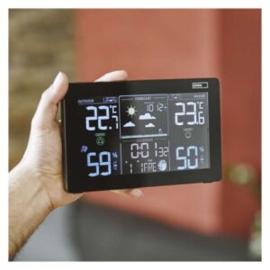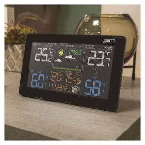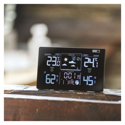 12/24 formát času: áno|anemometer: nie|barometer: áno|budík: áno, 2×|časové pásma: áno|dátum: áno|dosah snímača: až 50 m|drôtová sonda k čidlu: 0,95 m|elektronické plošné podsvietenie: áno|farebný displej (black mask) podsvietený: áno|fázy mesiaca: áno|hodiny: riadené DCF signálom|kalendár: áno|korekcia nadmorskej výšky: nie|LED podsvietenie displeja: áno|min. a max. teplota: áno|možné ďalšie čidlo: 3 (E05018)|možnosť nastavenia jednotky teploty °C/°F: °C/°F|možnosť zavesenia na stenu: áno|napájanie čidla: 2× 1,5 V AAA (nie sú súčasťou balenia)|napájanie stanice: 3× 1,5 V AAA (nie sú súčasťou balenia)|opakované budenie: áno|predajný obal: 1 ks, krabička|predpoveď počasia: áno|prenosová frekvencia: 433 MHz|prevedenie teplomera: bezdrôtové|produkt: metestanica|projekcia: nie|rozmer čidla: 21 × 60 × 100 mm|rozmer hlavnej jednotky: 26 × 197 × 125 mm|sieťový adaptér: áno, 5 V DC/600 mA (súčasťou balenia)|teplotná výstraha: nie|trend teploty: áno|trend tlaku: áno|trvalé podsvietenie: áno|veľkosť displeja: 164 × 90 mm|vnútorná teplota: -10 °C až +50 °C, rozlíšenie 0,1 °C|vnútorná vlhkosť: 1 % až 99 % RV, rozlíšenie 1 %|vonkajšia teplota: -40 °C až +70 °C, rozlíšenie 0,1 °C|vonkajšia vlhkosť: 20 % až 95 % RV, rozlíšenie 1 %|zrážkomer: nie
