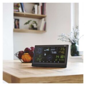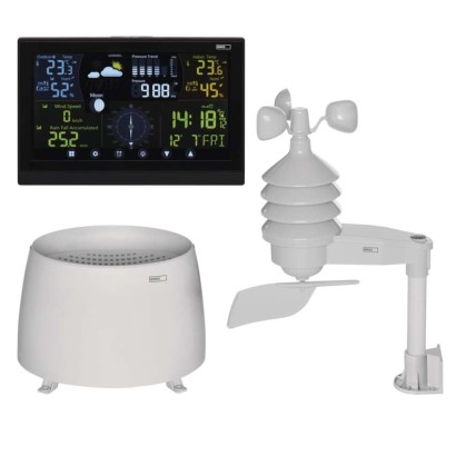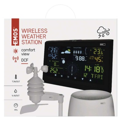 12/24 formát času: áno|anemometer: áno|barometer: áno|budík: áno, 2×|časové pásma: áno|dátum: áno|dosah snímača: až 100 m|drôtová sonda k čidlu: nie|elektronické plošné podsvietenie: áno|farebný displej (black mask) podsvietený: nie|fázy mesiaca: áno|hodiny: riadené DCF signálom|kalendár: áno|korekcia nadmorskej výšky: áno|LED podsvietenie displeja: áno|min. a max. teplota: áno|možné ďalšie čidlo: až 3 snímače teploty a vlhkosti (E06018), 1 snímač anemometer (E06016)|možnosť nastavenia jednotky teploty °C/°F: °C/°F|možnosť zavesenia na stenu: áno|napájanie čidla: 4× 1,5 V AA (nie sú súčasťou balenia)|napájanie stanice: 3× 1,5 V AAA (nie sú súčasťou balenia)|opakované budenie: áno|predajný obal: 1 ks, krabička|predpoveď počasia: áno|prenosová frekvencia: 433 MHz|prevedenie teplomera: bezdrôtové|produkt: metestanica|projekcia: nie|rozmer čidla: 250 × 160 × 100 mm|rozmer hlavnej jednotky: 17 × 192 × 127 mm|sieťový adaptér: áno, 5 V DC/300 mA (súčasťou balenia)|teplotná výstraha: áno|trend teploty: áno|trend tlaku: áno|trvalé podsvietenie: áno|veľkosť displeja: 168 × 93 mm|vnútorná teplota: -10 °C až +50 °C, rozlíšenie 0,1 °C|vnútorná vlhkosť: 1 % až 99 % RV, rozlíšenie 1 %|vonkajšia teplota: -30 °C až +60 °C, rozlíšenie 0,1 °C|vonkajšia vlhkosť: 1 % až 99 % RV, rozlíšenie 1 %|zrážkomer: áno