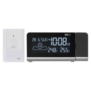 Domáca bezdrôtová meteostanica E8466, projekčná 12/24 formát času: áno|anemometer: nie|barometer: nie|budík: áno, 2×|časové pásma: nie|dátum: áno|dosah snímača: až 30 m|drôtová sonda k čidlu: nie|elektronické plošné podsvietenie: nie|farebný displej (black mask) podsvietený: áno|fázy mesiaca: nie|hodiny: riadené DCF signálom|kalendár: áno|korekcia nadmorskej výšky: nie|LED podsvietenie displeja: nie|min. a max. teplota: áno|možné ďalšie čidlo: 3 (E08400)|možnosť nastavenia jednotky teploty […] zobraziť celý popis