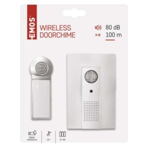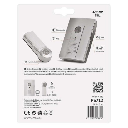 dosah tlačidla: 100 m|farba: strieborná|maximálna hlasitosť zvonenia: 80 dB|možnosť pridať ďalšie tlačidlo: áno, max. 8|napájanie hlavnej jednotky: 3× 1,5 V AA (nie sú súčasťou balenia)|napájanie tlačidla: 1× 3 V CR2032 (súčasťou balenia)|optická signalizácia na tlačidle: áno|optická signalizácia na zvončeku: áno|počet melódií: 16|počet prijímačov v balení: 1 ks|počet tlačidiel v balení: 1 ks|predajný obal: 1 ks, blister|prenosová frekvencia: 433 MHz|prídavné (náhradné) tlačidlo: P5723T|regulácia hlasitosti: áno|rozmer tlačidla: 23 × 93 × 34 mm|rozmer zvončeka: 30 × 70 × 110 mm|špeciálne funkcie: nie|spôsob párovania: automatické párovanie – self-learning|spôsob prenosu: bezdrôtový zvonček|vodeodolné tlačidlo: IP44