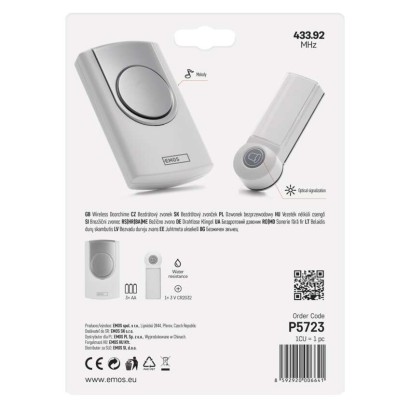 dosah tlačidla: 100 m|farba: biela|maximálna hlasitosť zvonenia: 75 dB|možnosť pridať ďalšie tlačidlo: áno, max. 8|napájanie hlavnej jednotky: 3× 1,5 V AA (nie sú súčasťou balenia)|napájanie tlačidla: 1× 3 V CR2032 (súčasťou balenia)|optická signalizácia na tlačidle: áno|optická signalizácia na zvončeku: nie|počet melódií: 36|počet prijímačov v balení: 1 ks|počet tlačidiel v balení: 1 ks|predajný obal: 1 ks, blister|prenosová frekvencia: 433 MHz|prídavné (náhradné) tlačidlo: P5723T|regulácia hlasitosti: nie|rozmer tlačidla: 23 × 93 × 34 mm|rozmer zvončeka: 29 × 72 × 125 mm|špeciálne funkcie: nie|spôsob párovania: automatické párovanie – self-learning|spôsob prenosu: bezdrôtový zvonček|vodeodolné tlačidlo: IP44
