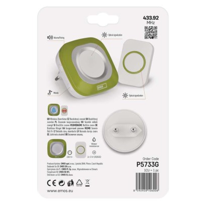 dosah tlačidla: 150 m|farba: zelená|maximálna hlasitosť zvonenia: 110 dB|možnosť pridať ďalšie tlačidlo: áno, max. 8|napájanie hlavnej jednotky: 230 V AC|napájanie tlačidla: 1× 3 V CR2032 (súčasťou balenia)|optická signalizácia na tlačidle: áno|optická signalizácia na zvončeku: áno|počet melódií: 36|počet prijímačov v balení: 1 ks|počet tlačidiel v balení: 1 ks|predajný obal: 1 ks, blister|prenosová frekvencia: 433 MHz|prídavné (náhradné) tlačidlo: P5732T|regulácia hlasitosti: áno, 4 úrovne|rozmer tlačidla: 17 × 40 × 60 mm|rozmer zvončeka: 74 × 74 × 74 mm|špeciálne funkcie: výrazná optická signalizácia zvonenia|spôsob párovania: automatické párovanie – self-learning|spôsob prenosu: bezdrôtový zvonček|vodeodolné tlačidlo: IP44