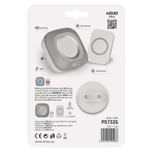 Domový bezdrôtový zvonček P5733S do zásuvky dosah tlačidla: 150 m|farba: strieborná|maximálna hlasitosť zvonenia: 110 dB|možnosť pridať ďalšie tlačidlo: áno, max. 8|napájanie hlavnej jednotky: 230 V AC|napájanie tlačidla: 1× 3 V CR2032 (súčasťou balenia)|optická signalizácia na tlačidle: áno|optická signalizácia na zvončeku: áno|počet melódií: 36|počet prijímačov v balení: 1 ks|počet tlačidiel v balení: 1 ks|predajný obal: 1 […] zobraziť celý popis