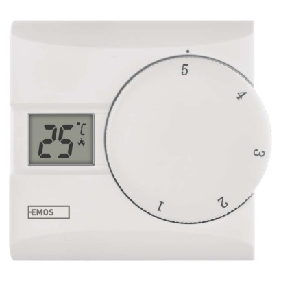dĺžka kapilárneho čidla: neuvádza sa|dosah vo voľnom priestore: neuvádza sa|druh regulácie: vykurovací a chladiaci systém|farba: biela|funkcia ON/OFF: nie|funkcia prázdniny: nie|funkcia Set-back: nie|kalibrácia teploty: nie|meranie teploty: 0 °C až 40 °C, rozlíšenie 1 °C|možnosť prepojenia s ďalšími detektormi: neuvádza sa|napájanie: 2× 1,5 V AA (súčasťou balenia)|napájanie brány: neuvádza sa|napájanie prijímača: neuvádza sa|napájanie vysielača: neuvádza sa|nastavenie teploty: 5 °C až 30 ° C, po 1 °C|nastaviteľný rozptyl teploty: 0,4 °C|ochrana proti zamrznutiu: áno|počet programov: užívateľsky nastaviteľná teplota|podsvietený displej: nie|pracovná frekvencia: neuvádza sa|predajný obal: 1 ks, krabička|protokol: –|rozmer: 40 × 93 × 86 mm|rozmer brány: neuvádza sa|rozmer prijímača: neuvádza sa|rozmer vysielača: neuvádza sa|spínaná záťaž: 6 A odporovo, 2 A induktívne|spínanie: 230 V AC alebo beznapäťové|súčasť balenia: neuvádza sa|typ nastavenia teploty: manuálne|typ ovládania: manuálny izbový termostat|typ termostatu: drôtový
