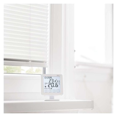dĺžka kapilárneho čidla: neuvádza sa|dosah vo voľnom priestore: 100 m|druh regulácie: vykurovací systém|farba: biela|funkcia ON/OFF: áno|funkcia prázdniny: áno|funkcia Set-back: nie|jazyky aplikácie: #|kalibrácia teploty: áno|kompatibilita: #|meranie teploty: 0 °C až 40 °C, rozlíšenie 0,1 °C|možnosť prepojenia s ďalšími detektormi: neuvádza sa|napájanie: neuvádza sa|napájanie brány: neuvádza sa|napájanie prijímača: 230 V AC|napájanie vysielača: 5 V USB adaptér (súčasťou balenia)|nastavenie teploty: 5 °C do 35 °C, rozlíšenie 0,5 °C|nastaviteľný rozptyl teploty: ±0,3 °C|notifikácie do mobilnej aplikácie: #|ochrana proti zamrznutiu: áno|ovládanie hlasovými asistentmi: #|počet programov: užívateľsky nastaviteľný|podlahový senzor: #|podporované OS: #|podsvietený displej: áno|pracovná frekvencia: 868 MHz|predajný obal: 1 ks, krabička|prenosová frekvencia: #|protokol: Wi-Fi|rozmer: neuvádza sa|rozmer brány: neuvádza sa|rozmer prijímača: 37 × 86 × 86 mm|rozmer vysielača: 15 × 96 × 96 mm|spínaná záťaž: 16 A odporovo, 4 A induktívne|spínanie: 230 V AC alebo beznapäťové|súčasť balenia: bezdrôtový termostat, bezdrôtový prijímač, USB adaptér 5 V / 1,5 A, micro USB kábel 1,5 m|typ nastavenia teploty: 6 teplotných zmien denne|typ ovládania: programovateľný elektronický izbový termostat, možnosť ovládania cez mobil (iOS, Android)|typ termostatu: bezdrôtový