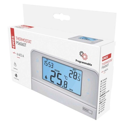 dĺžka kapilárneho čidla: neuvádza sa|dosah vo voľnom priestore: neuvádza sa|druh regulácie: vykurovací a chladiaci systém|farba: biela|funkcia ON/OFF: áno|funkcia prázdniny: áno|funkcia Set-back: nie|kalibrácia teploty: áno|meranie teploty: 0 °C až 40 °C, rozlíšenie 0,1 °C|možnosť prepojenia s ďalšími detektormi: neuvádza sa|napájanie: 2× 1,5 V AA (súčasťou balenia)|napájanie brány: neuvádza sa|napájanie prijímača: neuvádza sa|napájanie vysielača: neuvádza sa|nastavenie teploty: 5 ° C až 35 ° C, po 0,5 ° C|nastaviteľný rozptyl teploty: 0,2 °C až 2 °C, po 0,1 °C|ochrana proti zamrznutiu: áno|počet programov: 1 užívateľsky nastaviteľný program alebo užívateľsky nastaviteľná teplota (6 × za deň)|podsvietený displej: áno|pracovná frekvencia: neuvádza sa|predajný obal: 1 ks, krabička|protokol: –|rozmer: 26 × 126 × 84 mm|rozmer brány: neuvádza sa|rozmer prijímača: neuvádza sa|rozmer vysielača: neuvádza sa|spínaná záťaž: 6 A odporovo, 2 A induktívne|spínanie: 230 V AC alebo beznapäťové|súčasť balenia: neuvádza sa|typ nastavenia teploty: 6 teplotných zmien denne|typ ovládania: programovateľný elektronický izbový termostat|typ termostatu: drôtový s OpenTherm komunikáciou