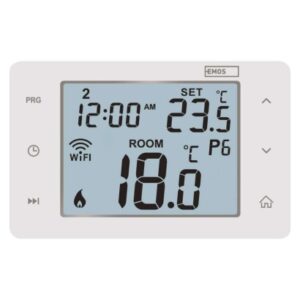 dĺžka kapilárneho čidla: neuvádza sa|dosah vo voľnom priestore: neuvádza sa|druh regulácie: vykurovací a chladiaci systém|farba: biela|funkcia ON/OFF: áno|funkcia prázdniny: áno|funkcia Set-back: nie|jazyky aplikácie: EN, CZ, SK, PL, DE, HU, SI, FR, + 60 ďalších jazykov|kalibrácia teploty: áno|kompatibilita: EMOS GoSmart, TUYA, LIDL, Smartlife, otvorený systém|meranie teploty: 0 °C až 40 °C, rozlíšenie 0,1 °C|možnosť prepojenia s ďalšími detektormi: neuvádza sa|napájanie: 230 V AC|napájanie brány: neuvádza sa|napájanie prijímača: neuvádza sa|napájanie vysielača: neuvádza sa|nastavenie teploty: 5 ° C až 35 ° C, po 0,5 ° C|nastaviteľný rozptyl teploty: 0,2 °C do 2 °C (rozlíšenie 0,1 °C)|notifikácie do mobilnej aplikácie: áno|ochrana proti zamrznutiu: áno|ovládanie hlasovými asistentmi: áno (Amazon Alexa, Google Assistant)|počet programov: užívateľsky nastaviteľná teplota (6× za deň)|podporované OS: Android, iOS|podsvietený displej: áno|pracovná frekvencia: neuvádza sa|predajný obal: 1 ks, krabička|prenosová frekvencia: 2,4 GHz WIFI (IEEE802.11b/g/n)|protokol: Wi-Fi|rozmer: 138 × 88 × 33 mm|rozmer brány: neuvádza sa|rozmer prijímača: neuvádza sa|rozmer vysielača: neuvádza sa|spínaná záťaž: 6 A odporovo, 2 A induktívne|spínanie: napäťové 230 V AC, 50 Hz|súčasť balenia: neuvádza sa|typ nastavenia teploty: 6 teplotných zmien denne|typ ovládania: programovateľný elektronický izbový termostat, možnosť ovládania cez mobil (iOS, Android)|typ termostatu: drôtový