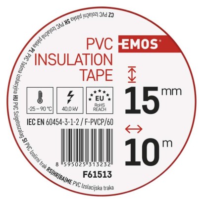 dĺžka návinu: 10 m|elektrická pevnosť minimálne: 40 kV/mm|elektrická pevnosť po vlhku minimálne: 35 kV/mm|farba: červená|hrúbka pásky: 0,13 mm|integrovaná textilná sieťka: nie|materiál lepidla: kaučuk|odolné UV: áno|odporúčaná skladovacia teplota: 10–45 °C|pevnosť v ťahu: 150 N/10 mm|potlač: bez potlače|predajný obal: 10 ks, fólia|predĺženie minimálne: 125 %|predpokladané použitie: izolácia káblov|priľnavosť k oceli minimálne: 1,8 N/10 mm|priľnavosť k podkladu: 1,5 N/10 mm|rozmer: 60 × 15 mm|rozsah inštalačných teplôt: -25–90 °C|samozhášavé: nie|šírka pásky: 15 mm|skúška plameňom: <1 sec|spĺňa smernicu REACH: áno|spĺňa smernicu ROHS: áno|typ pásky: PVC|vodotesný spoj: áno|vyhovuje norme: ČSN EN 60454-3-1|vytvára tlakotesný spoj: nie