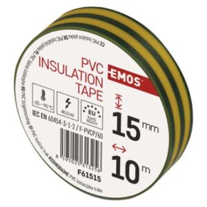 dĺžka návinu: 10 m|elektrická pevnosť minimálne: 40 kV/mm|elektrická pevnosť po vlhku minimálne: 35 kV/mm|farba: zelená/žltá|hrúbka pásky: 0,13 mm|integrovaná textilná sieťka: nie|materiál lepidla: kaučuk|odolné UV: áno|odporúčaná skladovacia teplota: 10–45 °C|pevnosť v ťahu: 150 N/10 mm|potlač: bez potlače|predajný obal: 10 ks, fólia|predĺženie minimálne: 125 %|predpokladané použitie: izolácia káblov|priľnavosť k oceli minimálne: 1,8 N/10 mm|priľnavosť k podkladu: 1,5 N/10 mm|rozmer: 60 × 15 mm|rozsah inštalačných teplôt: -25–90 °C|samozhášavé: nie|šírka pásky: 15 mm|skúška plameňom: <1 sec|spĺňa smernicu REACH: áno|spĺňa smernicu ROHS: áno|typ pásky: PVC|vodotesný spoj: áno|vyhovuje norme: ČSN EN 60454-3-1-2/F-PVC/60|vytvára tlakotesný spoj: nie