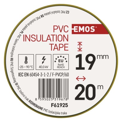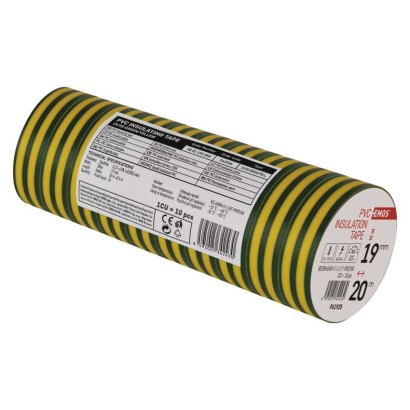 dĺžka návinu: 20 m|elektrická pevnosť minimálne: 40 kV/mm|elektrická pevnosť po vlhku minimálne: 35 kV/mm|farba: zelená/žltá|hrúbka pásky: 0,13 mm|integrovaná textilná sieťka: nie|materiál lepidla: kaučuk|odolné UV: áno|odporúčaná skladovacia teplota: 10–45 °C|pevnosť v ťahu: 150 N/10 mm|potlač: bez potlače|predajný obal: 10 ks, fólia|predĺženie minimálne: 125 %|predpokladané použitie: izolácia káblov|priľnavosť k oceli minimálne: 1,8 N/10 mm|priľnavosť k podkladu: 1,5 N/10 mm|rozmer: 70 × 20 mm|rozsah inštalačných teplôt: -25–90 °C|samozhášavé: nie|šírka pásky: 19 mm|skúška plameňom: <1 sec|spĺňa smernicu REACH: áno|spĺňa smernicu ROHS: áno|typ pásky: PVC|vodotesný spoj: áno|vyhovuje norme: ČSN EN 60454-3-1|vytvára tlakotesný spoj: nie