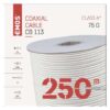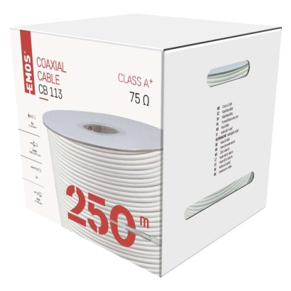 Koaxiálny kábel CB113, 250m APE = vzduchové dielektrikum: nie|činiteľ skrátenia: 0,85|dielektrikum typ, priemer: FPE 4,8 mm|farba izolácie napájacích vodičov: neuvádza sa|farba plášťa kábla: biela|FPE = penové dielektrikum: áno|hmotnosť (kg/km): 41,5|impedancia: 75 Ohm|izolácia napájacích vodičov: neuvádza sa|izolačný odpor medzi jadrami pri 20 °C (MOhm/ km): 1 000|kapacita (pF/ m): 52|konštrukcia napájacích vodičov: neuvádza sa|materiál plášťa kábla: […] zobraziť celý popis