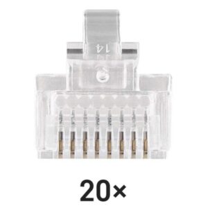 kategória: CAT5E|materiál konektorov: PE/50 µ zlata – 70 µ nikel|maximálna prevádzková vlhkosť: 93 %|min. životnosť: 1 000 cyklov zapojenie/odpojenie|počet konektorov: neuvádza sa|použitie: splietané lanko/licna|predajný obal: 20 ks, PVC sáčok|prevádzková teplota: -10–60 °C|rozmer: 22 × 12 × 10 mm|skladovacia teplota: -40–70 °C|tienenie: nie|typ: konektor RJ45 8p8c|určené pre kábel: UTP