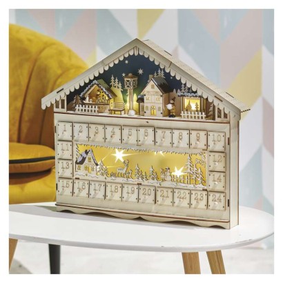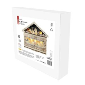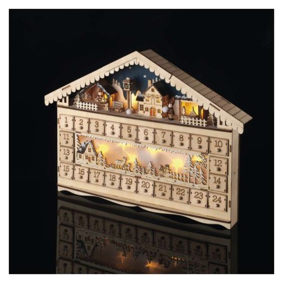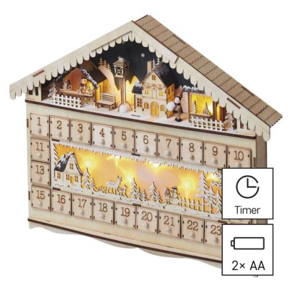 časovač: áno|diaľkový ovládač: nie|dĺžka prívodu: neuvádza sa|farba drôtu: neuvádza sa|farba svetla: teplá biela|krytie: IP20|materiál: drevo|počet LED: 10|použitie: vnútorné|predajný obal: 1 ks, krabica|príkon: 0,4 W|produkt: adventný kalendár|rozmer: 50 × 40 cm|typ napájania: batéria (2× AA)|vstupné napätie: neuvádza sa|výstupné napätie: 3 V DC|záručná doba: 2 roky|zdroj svetla: LED|životnosť: 10 000 hodín