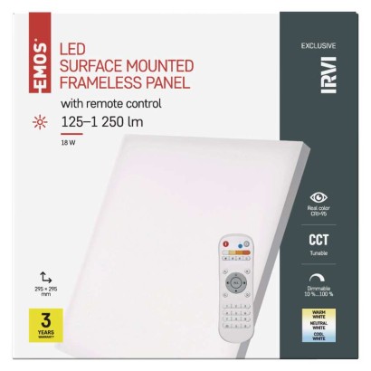 diaľkový ovládač: áno|do chodby a na schodisko: nie|do dielne a garáže: nie|do kancelárie: áno|do kuchyne: áno|do kúpeľne: nie|do obývačky, spálne a detskej izby: áno|dosah senzora: nemá senzor|do záhrady a na balkón: nie|farba svetla: teplá biela–studená biela|farba tela: biela|flicker-free: áno|frekvencia: 50/60 Hz|index podania farieb (CRI): Ra > 95|kategória: EXCLUSIVE|krytie: IP20|materiál difúzora: plast (PC)|materiál LGP: PS|materiál tela: hliník|montážny otvor: neuvádza sa|možnosť stmievania: áno|náhrada za žiarovku: neuvádza sa|napätie: 220–240 V|pohybový senzor: nie|predajný obal: 1 ks, krabica|príkon: 18 W|prúd: 95 mA|rada: IRVI|rozmer: 295 × 295 × 61 mm|spôsob montáže: prisadené|svetelná účinnosť: 70 lm/W|svetelný tok: 125–1 250 lm|teplota chromatičnosti: 2 700–6 000 K|tvar: štvorec|typ difúzora: mliečny|typ svietidla: klasické svietidlo|účinník: > 0,9|UGR<: 22|uhol vyžarovania: 115°|umiestnenie: stropné|výstupný prúd zo zdroja: neuvádza sa|záručná doba: 3 roky|zdroj svetla: LED|životnosť: 30 000 hodín