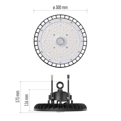 akumulátor: neuvádza sa|dĺžka prívodného kábla: 30 cm|doba svietenia na AKU: neuvádza sa|dosah PIR senzora: nemá PIR|farba: čierna|farba svetla: neutrálna biela|frekvencia: 50/60 Hz|index podania farieb (CRI): Ra > 80|krytie: IP65|materiál difúzora: plast (PC)|materiál prívodného kábla: guma|materiál tela: hliník|napájanie: zo siete|napätie: 220–240 V~|PIR senzor: nie|počet priechodných zásuviek: neuvádza sa|použitie: závesná montáž|predajný obal: 1 ks, krabica|príkon: 150 W|prúd: 650 mA|rada: ASTER|rozmer: priemer 300 × 173 mm|rozsah pracovnej teploty: -35 °C až +50 °C|skúšobná žiarovka súčasťou balenia: nie|stmievanie: nie|stupeň ochrany proti mechanickým nárazom: IK08|svetelný tok: 25 500 lm|teplota chromatičnosti: 4 000 K|typ priechodných zásuviek: neuvádza sa|typ prívodného kábla: neuvádza sa|účinník: > 0,9|uhol vyžarovania: 90°|záručná doba: 5 rokov|zdroj svetla: LED|životnosť: 50 000 hodín