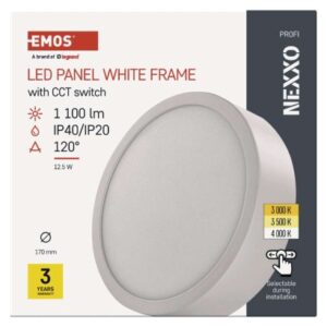 diaľkový ovládač: nie|do chodby a na schodisko: áno|do dielne a garáže: nie|do kancelárie: áno|do kuchyne: áno|do kúpeľne: nie|do obývačky, spálne a detskej izby: áno|dosah senzora: nemá senzor|do záhrady a na balkón: nie|farba svetla: teplá biela–neutrálna biela|farba tela: biela|flicker-free: áno|frekvencia: 50/60 Hz|index podania farieb (CRI): Ra > 80|kategória: PROFI|krytie: IP40/IP20|materiál difúzora: plast (PMMA)|materiál LGP: PMMA|materiál tela: oceľový plech|montážny otvor: neuvádza sa|možnosť stmievania: nie|náhrada za žiarovku: 75 W|napätie: 220–240 V|pohybový senzor: nie|predajný obal: 1 ks, krabica|príkon: 12,5 W|prúd: 300 mA|rada: NEXXO|rozmer: priemer 170 × 42 mm|spôsob montáže: prisadené|svetelná účinnosť: 90 lm/W|svetelný tok: 1 100 lm|teplota chromatičnosti: 3 000/3 500/4 000 K|tvar: kruh|typ difúzora: mliečny|typ svietidla: klasické svietidlo|účinník: > 0,5|UGR<: neuvádza sa|uhol vyžarovania: 120°|umiestnenie: stropné/nástenné|výstupný prúd zo zdroja: neuvádza sa|záručná doba: 3 roky|zdroj svetla: LED|životnosť: 30 000 hodín