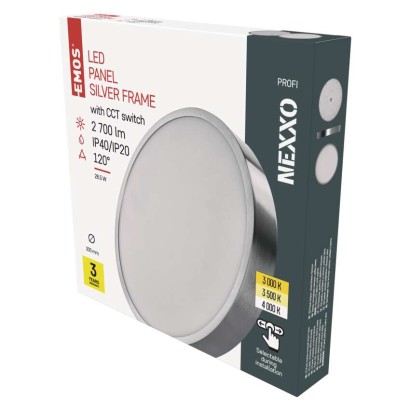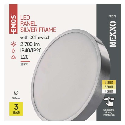 diaľkový ovládač: nie|do chodby a na schodisko: áno|do dielne a garáže: nie|do kancelárie: áno|do kuchyne: áno|do kúpeľne: nie|do obývačky, spálne a detskej izby: áno|dosah senzora: nemá senzor|do záhrady a na balkón: nie|farba svetla: teplá biela–neutrálna biela|farba tela: brúsený nikel|flicker-free: áno|frekvencia: 50/60 Hz|index podania farieb (CRI): Ra > 80|kategória: PROFI|krytie: IP40/IP20|materiál difúzora: plast (PMMA)|materiál LGP: PMMA|materiál tela: oceľový plech|montážny otvor: neuvádza sa|možnosť stmievania: nie|náhrada za žiarovku: 160 W|napätie: 220–240 V|pohybový senzor: nie|predajný obal: 1 ks, krabica|príkon: 28,5 W|prúd: 700 mA|rada: NEXXO|rozmer: priemer 300 × 42 mm|spôsob montáže: prisadené|svetelná účinnosť: 95 lm/W|svetelný tok: 2 700 lm|teplota chromatičnosti: 3 000/3 500/4 000 K|tvar: kruh|typ difúzora: mliečny|typ svietidla: klasické svietidlo|účinník: > 0,9|UGR<: neuvádza sa|uhol vyžarovania: 120°|umiestnenie: stropné/nástenné|výstupný prúd zo zdroja: neuvádza sa|záručná doba: 3 roky|zdroj svetla: LED|životnosť: 30 000 hodín