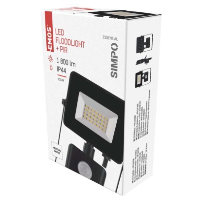 LED reflektor SIMPO s pohybovým čidlom 20,5W neutrálna biela akumulátor: neuvádza sa|dĺžka prívodného kábla: 20 cm|doba svietenia na AKU: neuvádza sa|dosah PIR senzora: 8 m|farba: čierna|farba svetla: neutrálna biela|frekvencia: 50/60 Hz|index podania farieb (CRI): Ra > 80|krytie: IP44|materiál difúzora: sklo|materiál prívodného kábla: guma|materiál tela: hliník|napájanie: zo siete|napätie: 220–240 V~|PIR senzor: áno|počet priechodných zásuviek: neuvádza sa|použitie: […] zobraziť celý popis
