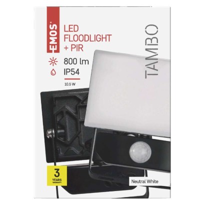 LED reflektor TAMBO s pohybovým čidlom, 10,5W akumulátor: neuvádza sa|dĺžka prívodného kábla: 30 cm|doba svietenia na AKU: neuvádza sa|dosah PIR senzora: 10 m|farba: čierna|farba svetla: neutrálna biela|frekvencia: 50/60 Hz|index podania farieb (CRI): Ra > 80|krytie: IP54|materiál difúzora: plast (PC)|materiál prívodného kábla: guma|materiál tela: hliník|napätie: 220–240 V~|PIR senzor: áno|počet priechodných zásuviek: 0|predajný obal: 1 ks, krabica|príkon: […] zobraziť celý popis