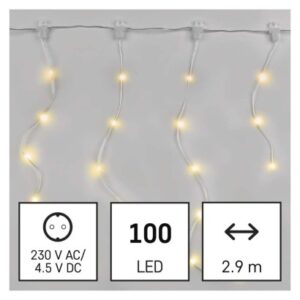 časovač: nie|diaľkový ovládač: nie|dĺžka prívodu: 5 m|farba drôtu: transparentná|farba svetla: teplá biela|funkcia: 8 módov (multifunkcie)|krytie: IP44|LED medzera: neuvádza sa|materiál: PVC|možnosť prepojenia: nie|počet LED: 100|použitie: vonkajšie aj vnútorné|predajný obal: 1 ks, krabica|pre výšku stromu: neuvádza sa|príkon: 2,1 W|produkt: kvaple|rozmer: 2,9 × 0,7 m|tvar: drop|typ napájania: sieťový adaptér|veľkosť LED: neuvádza sa|vstupné napätie: 230 V AC|výstupné napätie: 4,5 V DC|záručná doba: 2 roky|životnosť: 10 000 hodín