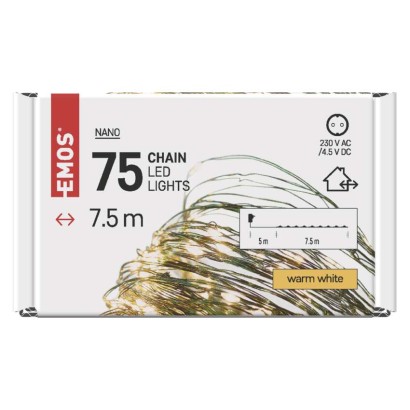 časovač: áno|diaľkový ovládač: nie|dĺžka prívodu: 5 m|farba drôtu: zelená|farba svetla: teplá biela|funkcia: svieti|krytie: IP44|LED medzera: 10 cm|materiál: kov|možnosť prepojenia: nie|počet LED: 75|použitie: vonkajšie aj vnútorné|predajný obal: 1 ks, krabica|pre výšku stromu: 140 cm|príkon: 2,7 W|produkt: nano reťaz|rozmer: 7,5 m|tvar: nano|typ napájania: sieťový adaptér|veľkosť LED: 3 mm (nano)|vstupné napätie: 230 V AC|výstupné napätie: 4,5 V DC|záručná doba: 2 roky|životnosť: 10 000 hodín