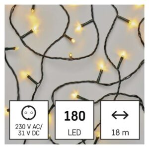 časovač: áno|diaľkový ovládač: nie|dĺžka prívodu: 5 m|farba drôtu: zelená|farba svetla: teplá biela|funkcia: svieti|krytie: IP44|LED medzera: 10 cm|materiál: PVC|možnosť prepojenia: nie|počet LED: 180|použitie: vonkajšie aj vnútorné|predajný obal: 1 ks, krabica|pre výšku stromu: 200 cm|príkon: 3,6 W|produkt: reťaz|rozmer: 18 m|tvar: klasický|typ napájania: sieťový adaptér|veľkosť LED: 5 mm|vstupné napätie: 230 V AC|výstupné napätie: 31 V DC|záručná doba: 2 roky|životnosť: 10 000 hodín