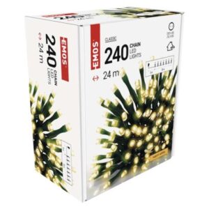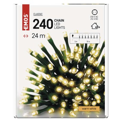 časovač: áno|diaľkový ovládač: nie|dĺžka prívodu: 5 m|farba drôtu: zelená|farba svetla: teplá biela|funkcia: svieti|krytie: IP44|LED medzera: 10 cm|materiál: PVC|možnosť prepojenia: nie|počet LED: 240|použitie: vonkajšie aj vnútorné|predajný obal: 1 ks, krabica|pre výšku stromu: 230 cm|príkon: 3,6 W|produkt: reťaz|rozmer: 24 m|tvar: klasický|typ napájania: sieťový adaptér|veľkosť LED: 5 mm|vstupné napätie: 230 V AC|výstupné napätie: 31 V DC|záručná doba: 2 roky|životnosť: 10 000 hodín