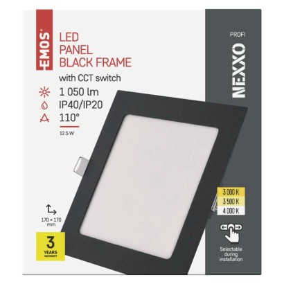 diaľkový ovládač: nie|do chodby a na schodisko: áno|do dielne a garáže: nie|do kancelárie: áno|do kuchyne: áno|do kúpeľne: nie|do obývačky, spálne a detskej izby: áno|dosah senzora: nemá senzor|do záhrady a na balkón: nie|farba svetla: teplá biela–neutrálna biela|farba tela: čierna|flicker-free: áno|frekvencia: 50/60 Hz|index podania farieb (CRI): Ra > 82|kategória: PROFI|krytie: IP40/IP20|materiál difúzora: plast (PS)|materiál LGP: PMMA|materiál tela: hliník|montážny otvor: 155 × 155 mm|možnosť stmievania: nie|náhrada za žiarovku: 70 W|napätie: 220–240 V|pohybový senzor: nie|predajný obal: 1 ks, krabica|príkon: 12,5 W|prúd: 109 mA|rada: NEXXO|rozmer: 170 × 170 × 21 mm|spôsob montáže: vstavané|svetelná účinnosť: 83 lm/W|svetelný tok: 1 050 lm|teplota chromatičnosti: 3 000/3 500/4 000 K|tvar: štvorec|typ difúzora: mliečny|typ svietidla: klasické svietidlo|účinník: > 0,5|UGR<: neuvádza sa|uhol vyžarovania: 110°|umiestnenie: stropné|výstupný prúd zo zdroja: 300 mA|záručná doba: 3 roky|zdroj svetla: LED|životnosť: 30 000 hodín