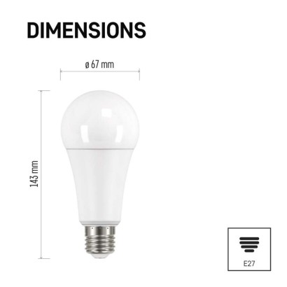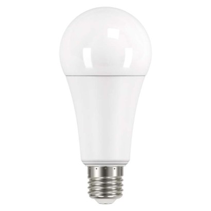 energetická trieda: E|farba svetla: studená biela|index podania farieb (CRI): Ra >80|náhrada za žiarovku: 150 W|napätie: 230 V~/50 Hz|pätica (uchytenie žiarovky): E27|počet čipov: neuvádza sa|počet spínacích cyklov: 25 000|predajný obal: 1 ks, krabička|príkon: 19 W|rada: CLASSIC|rozmer: 143 × 67 × 67 mm|stmievateľná: nie|svetelná účinnosť: 129 lm/W|svetelný tok: 2 452 lm|technológia: LED|teplota chromatičnosti: 6 500 K|tvar: A67|typ čipov: SMD|účinník: 0,56|uhol vyžarovania: 200°|záručná doba: 3 roky|životnosť: 30 000 hodín