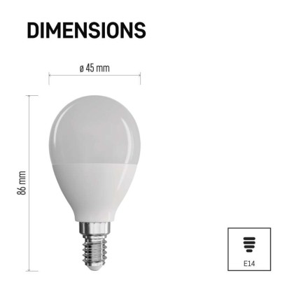 energetická trieda: E|farba svetla: neutrálna biela|index podania farieb (CRI): Ra >80|náhrada za žiarovku: 60 W|napätie: 230 V~/50 Hz|pätica (uchytenie žiarovky): E14|počet čipov: neuvádza sa|počet spínacích cyklov: 25 000|predajný obal: 1 ks, krabička|príkon: 7,3 W|rada: CLASSIC|rozmer: 86 × 45 × 45 mm|stmievateľná: nie|svetelná účinnosť: 110 lm/W|svetelný tok: 806 lm|technológia: LED|teplota chromatičnosti: 4 000 K|tvar: Mini Globe|typ čipov: SMD|účinník: 0,56|uhol vyžarovania: 220°|záručná doba: 3 roky|životnosť: 30 000 hodín