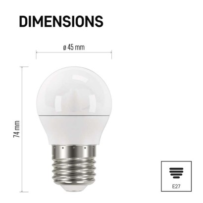 LED žiarovka Classic Mini Globe / E27 / 5 W (40 W) / 470 lm / neutrálna biela energetická trieda: F|farba svetla: neutrálna biela|index podania farieb (CRI): Ra >80|náhrada za žiarovku: 40 W|napätie: 230 V~/50 Hz|pätica (uchytenie žiarovky): E27|počet čipov: 8|počet spínacích cyklov: 25 000|predajný obal: 3 ks, krabička|príkon: 5 W|rada: CLASSIC|rozmer: 74 × 45 […] zobraziť celý popis