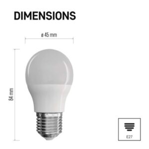 energetická trieda: E|farba svetla: neutrálna biela|index podania farieb (CRI): Ra >80|náhrada za žiarovku: 60 W|napätie: 230 V~/50 Hz|pätica (uchytenie žiarovky): E27|počet čipov: neuvádza sa|počet spínacích cyklov: 25 000|predajný obal: 1 ks, krabička|príkon: 7,3 W|rada: CLASSIC|rozmer: 84 × 45 × 45 mm|stmievateľná: nie|svetelná účinnosť: 110 lm/W|svetelný tok: 806 lm|technológia: LED|teplota chromatičnosti: 4 000 K|tvar: Mini Globe|typ čipov: SMD|účinník: 0.55|uhol vyžarovania: 220°|záručná doba: 3 roky|životnosť: 30 000 hodín