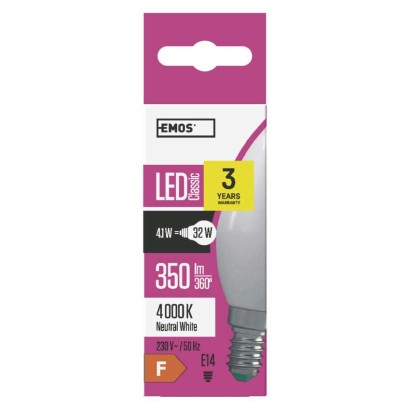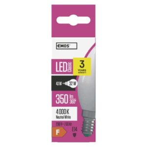 LED žiarovka Classic sviečka / E14 / 4,1 W (32 W) / 350 lm / neutrálna biela energetická trieda: F|farba svetla: neutrálna biela|index podania farieb (CRI): Ra >80|náhrada za žiarovku: 32 W|napätie: 230 V~/50 Hz|pätica (uchytenie žiarovky): E14|počet čipov: neuvádza sa|počet spínacích cyklov: 25 000|predajný obal: 1 ks, krabička|príkon: 4,1 W|rada: CLASSIC|rozmer: 100 × 38 […] zobraziť celý popis