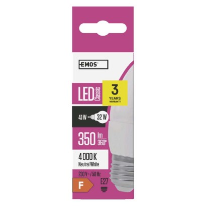 LED žiarovka Classic sviečka / E27 / 4,1 W (32 W) / 350 lm / neutrálna biela energetická trieda: F|farba svetla: neutrálna biela|index podania farieb (CRI): Ra >80|náhrada za žiarovku: 32 W|napätie: 230 V~/50 Hz|pätica (uchytenie žiarovky): E27|počet čipov: neuvádza sa|počet spínacích cyklov: 25 000|predajný obal: 1 ks, krabička|príkon: 4,1 W|rada: CLASSIC|rozmer: 100 × 38 […] zobraziť celý popis
