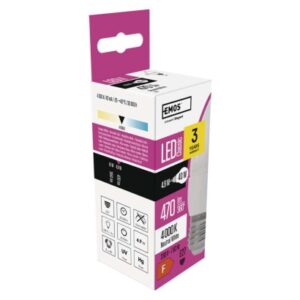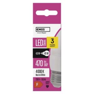 LED žiarovka Classic sviečka / E27 / 4,9 W (40 W) / 470 lm / neutrálna biela energetická trieda: F|farba svetla: neutrálna biela|index podania farieb (CRI): Ra >80|náhrada za žiarovku: 40 W|napätie: 230 V~/50 Hz|pätica (uchytenie žiarovky): E27|počet čipov: neuvádza sa|počet spínacích cyklov: 25 000|predajný obal: 1 ks, krabička|príkon: 4,9 W|rada: CLASSIC|rozmer: 101 × 37 […] zobraziť celý popis