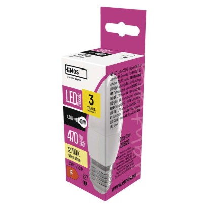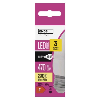 energetická trieda: F|farba svetla: teplá biela|index podania farieb (CRI): Ra >80|náhrada za žiarovku: 40 W|napätie: 230 V~/50 Hz|pätica (uchytenie žiarovky): E27|počet čipov: neuvádza sa|počet spínacích cyklov: 25 000|predajný obal: 1 ks, krabička|príkon: 4,9 W|rada: CLASSIC|rozmer: 101 × 37 × 37 mm|stmievateľná: nie|svetelná účinnosť: 96 lm/W|svetelný tok: 470 lm|technológia: LED|teplota chromatičnosti: 2 700 K|tvar: sviečka|typ čipov: SMD|účinník: 0,5|uhol vyžarovania: 270°|záručná doba: 3 roky|životnosť: 30 000 hodín