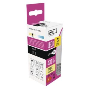 LED žiarovka Classic sviečka / E27 / 4,9 W (40 W) / 470 lm / teplá biela energetická trieda: F|farba svetla: teplá biela|index podania farieb (CRI): Ra >80|náhrada za žiarovku: 40 W|napätie: 230 V~/50 Hz|pätica (uchytenie žiarovky): E27|počet čipov: neuvádza sa|počet spínacích cyklov: 25 000|predajný obal: 1 ks, krabička|príkon: 4,9 W|rada: CLASSIC|rozmer: 101 × 37 […] zobraziť celý popis