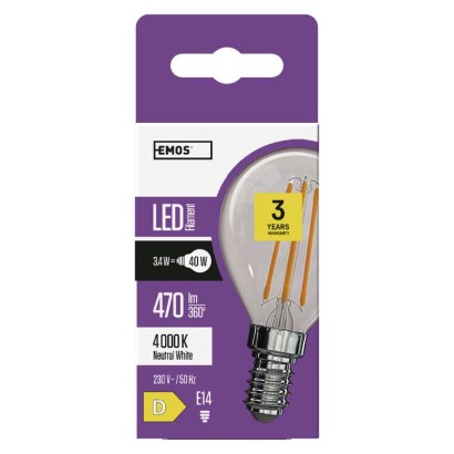 energetická trieda: D|farba svetla: neutrálna biela|index podania farieb (CRI): Ra >80|náhrada za žiarovku: 40 W|napätie: 230 V~/50 Hz|pätica (uchytenie žiarovky): E14|počet čipov: 4|počet spínacích cyklov: 30 000|predajný obal: 1 ks, krabička|príkon: 3,4 W|rada: FILAMENT|rozmer: 80 × 45 × 45 mm|stmievateľná: nie|svetelná účinnosť: 138 lm/W|svetelný tok: 470 lm|technológia: LED|teplota chromatičnosti: 4 000 K|tvar: Mini Globe|typ čipov: COB|účinník: 0,48|uhol vyžarovania: 320°|záručná doba: 3 roky|životnosť: 25 000 hodín
