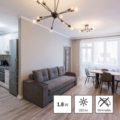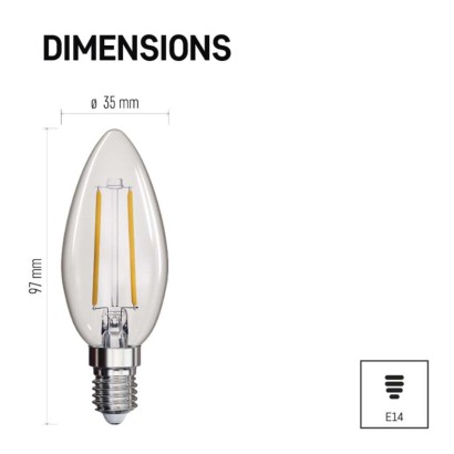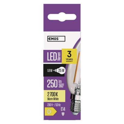 energetická trieda: D|farba svetla: teplá biela|index podania farieb (CRI): Ra >80|náhrada za žiarovku: 25 W|napätie: 230 V~/50 Hz|pätica (uchytenie žiarovky): E14|počet čipov: 2|počet spínacích cyklov: 30 000|predajný obal: 1 ks, krabička|príkon: 1,8 W|rada: FILAMENT|rozmer: 97 × 35 × 35 mm|stmievateľná: nie|svetelná účinnosť: 139 lm/W|svetelný tok: 250 lm|technológia: LED|teplota chromatičnosti: 2 700 K|tvar: sviečka|typ čipov: COB|účinník: 0,41|uhol vyžarovania: 320°|záručná doba: 3 roky|životnosť: 25 000 hodín