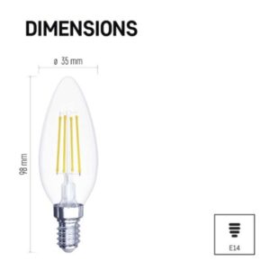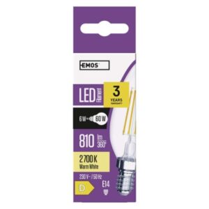 energetická trieda: D|farba svetla: teplá biela|index podania farieb (CRI): Ra >80|náhrada za žiarovku: 60 W|napätie: 230 V~/50 Hz|pätica (uchytenie žiarovky): E14|počet čipov: 4|počet spínacích cyklov: 30 000|predajný obal: 1 ks, krabička|príkon: 6 W|rada: FILAMENT|rozmer: 98 × 35 × 35 mm|stmievateľná: nie|svetelná účinnosť: 135 lm/W|svetelný tok: 810 lm|technológia: LED|teplota chromatičnosti: 2 700 K|tvar: sviečka|typ čipov: COB|účinník: 0,480|uhol vyžarovania: 320°|záručná doba: 3 roky|životnosť: 25 000 hodín