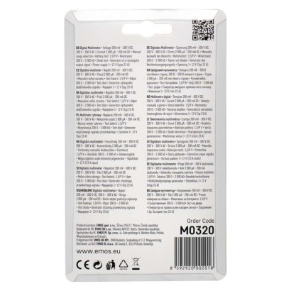 AC napätie: 200–300 V|AC prúd: nie|automatické vypnutie: nie|bezkontaktná detekcia AC napätia: nie|DC napätie: 200 mV – 300 V|DC prúd: 2 000 µA – 200 mA|elektrický odpor: 200 Ohm – 2 MOhm|indikácia slabej batérie: áno|kliešťový multimeter: nie|kontaktná detekcia AC napätia: nie|meranie teploty: nie|napájanie: 1× 12 V (súčasťou balenia)|podsvietenie displeja: nie|predajný obal: 1 ks, blister|rozmer: 30 × 57 × 95 mm|spojitosť obvodov: nie|súčasť dodávky: batéria, návod, meracie hroty|test batérií: 1,5 V/9 V|test diód: áno|test tranzistorov: nie|voľba rozsahu: manuálny|záznam max. hodnoty: nie|záznam nameranej hodnoty: nie|zobrazenie displeja: 3,5 digit