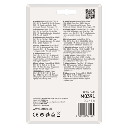 AC napätie: 200–300 V|AC prúd: nie|automatické vypnutie: nie|bezkontaktná detekcia AC napätia: nie|DC napätie: 200 mV – 300 V|DC prúd: 20 µA – 10 A|elektrický odpor: 200 Ohm – 2 MOhm|indikácia slabej batérie: áno|kliešťový multimeter: nie|kontaktná detekcia AC napätia: nie|meranie teploty: nie|napájanie: 1× 9 V (súčasťou balenia)|podsvietenie displeja: nie|predajný obal: 1 ks, blister|rozmer: 27 × 70 × 135 mm|spojitosť obvodov: áno|súčasť dodávky: batéria, návod, meracie hroty, ochranné puzdro|test batérií: nie|test diód: áno|test tranzistorov: nie|voľba rozsahu: manuálny|záznam max. hodnoty: nie|záznam nameranej hodnoty: nie|zobrazenie displeja: 3,5 digit