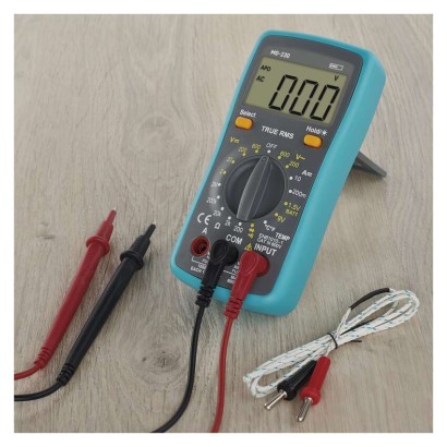 AC napätie: 200–600 V|AC prúd: 200 mA – 10 A|automatické vypnutie: áno|bezkontaktná detekcia AC napätia: nie|DC napätie: 2–600 V|DC prúd: 200 mA – 10 A|elektrický odpor: 200 Ohm – 2 MOhm|indikácia slabej batérie: áno|kliešťový multimeter: nie|kontaktná detekcia AC napätia: nie|meranie teploty: -40 °C až +300 °C|napájanie: 3× 1,5 V AAA (súčasťou balenia)|podsvietenie displeja: áno|predajný obal: 1 ks, blister|rozmer: 35 × 75 × 155 mm|spojitosť obvodov: áno|súčasť dodávky: batérie, návod, meracie hroty, teplotná sonda|test batérií: 1,5 V/9 V|test diód: áno|test tranzistorov: nie|voľba rozsahu: manuálny|záznam max. hodnoty: nie|záznam nameranej hodnoty: áno|zobrazenie displeja: 3,5 digit