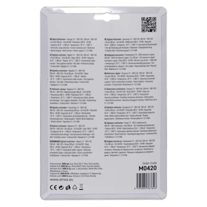 AC napätie: 2–300 V|AC prúd: 200 uA – 10 A / s kliešťami až 1 000 A (nie sú súčasťou balenia)|automatické vypnutie: áno|bezkontaktná detekcia AC napätia: nie|DC napätie: 200 mV – 300 V|DC prúd: 200 µA – 10 A / s kliešťami až 1 000 A (nie sú súčasťou balenia)|elektrický odpor: 200 Ohm – 20 MOhm|indikácia slabej batérie: áno|kliešťový multimeter: nie|kontaktná detekcia AC napätia: nie|meranie teploty: -20 °C až +1 000 °C|napájanie: 3× 1,5 V AAA (súčasťou balenia)|podsvietenie displeja: áno|predajný obal: 1 ks, blister|rozmer: 35 × 75 × 158 mm|spojitosť obvodov: áno|súčasť dodávky: batéria, návod, meracie hroty, redukcia pre meranie tranzistorov, teplotná sonda typu K, zámok pre kryt batérie|test batérií: nie|test diód: áno|test tranzistorov: áno|voľba rozsahu: automatická|záznam max. hodnoty: áno|záznam nameranej hodnoty: áno|zobrazenie displeja: 3,5 digit