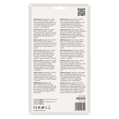 AC napätie: 600 mV – 750 V|AC prúd: 600 µA–10 A|automatické vypnutie: áno|bezkontaktná detekcia AC napätia: nie|DC napätie: 600 mV – 1 000 V|DC prúd: 600 µA–10 A|elektrický odpor: 600 Ohm – 60 MOhm|indikácia slabej batérie: áno|kliešťový multimeter: nie|kontaktná detekcia AC napätia: nie|meranie teploty: -40 °C až +300 °C|napájanie: 1× 9 V (súčasťou balenia)|podsvietenie displeja: áno|predajný obal: 1 ks, blister|rozmer: 35 × 90 × 190 mm|spojitosť obvodov: áno|súčasť dodávky: batérie, meracie hroty, redukcia pre meranie tranzistorov, tepl. sonda typu K|test batérií: nie|test diód: áno|test tranzistorov: áno|voľba rozsahu: automatická aj manuálna|záznam max. hodnoty: áno|záznam nameranej hodnoty: áno|zobrazenie displeja: 5 3/4 digit